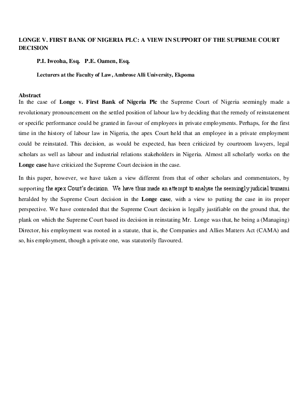 (PDF) LONGE V. FIRST BANK OF NIGERIA PLC: A VIEW IN ...